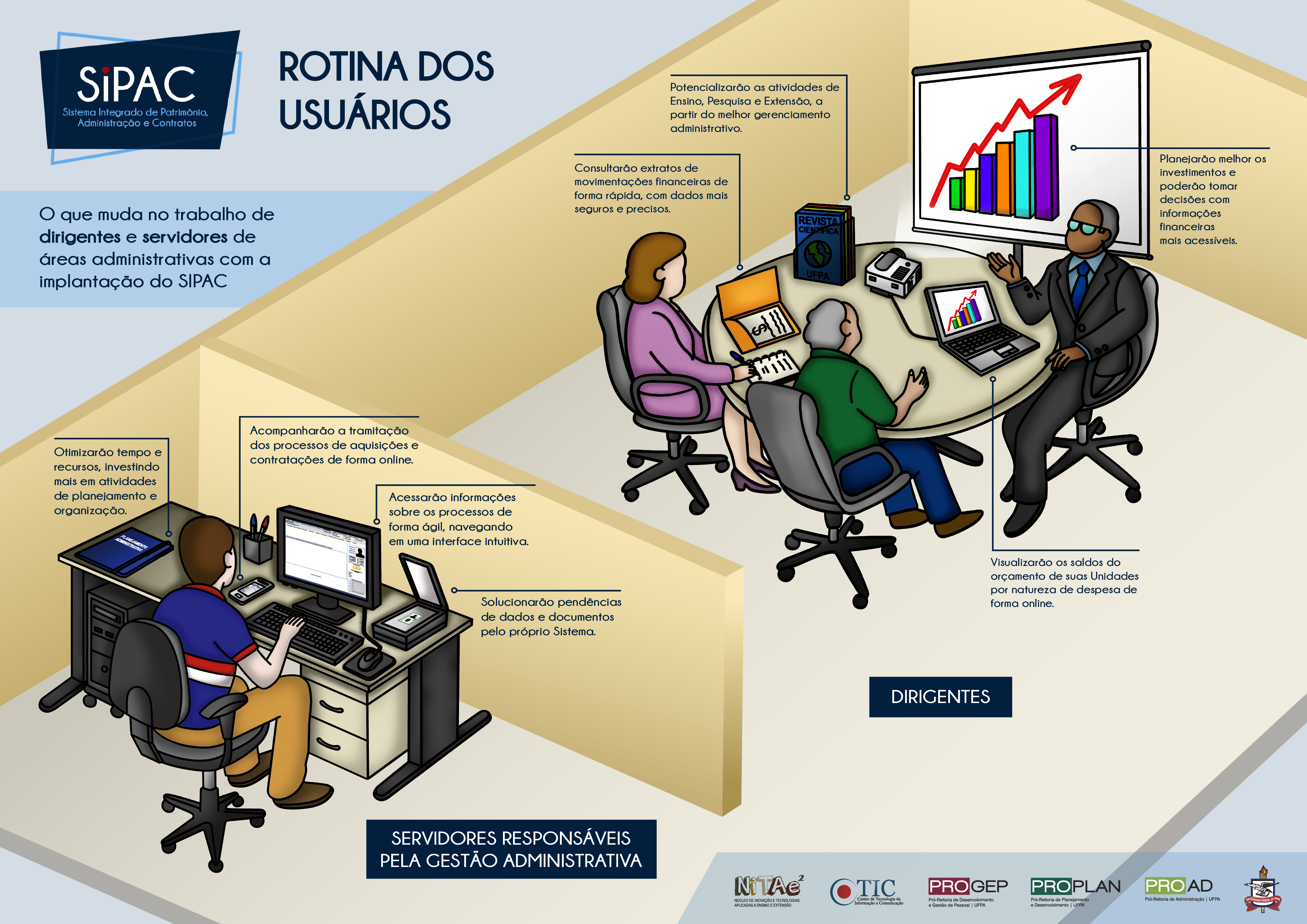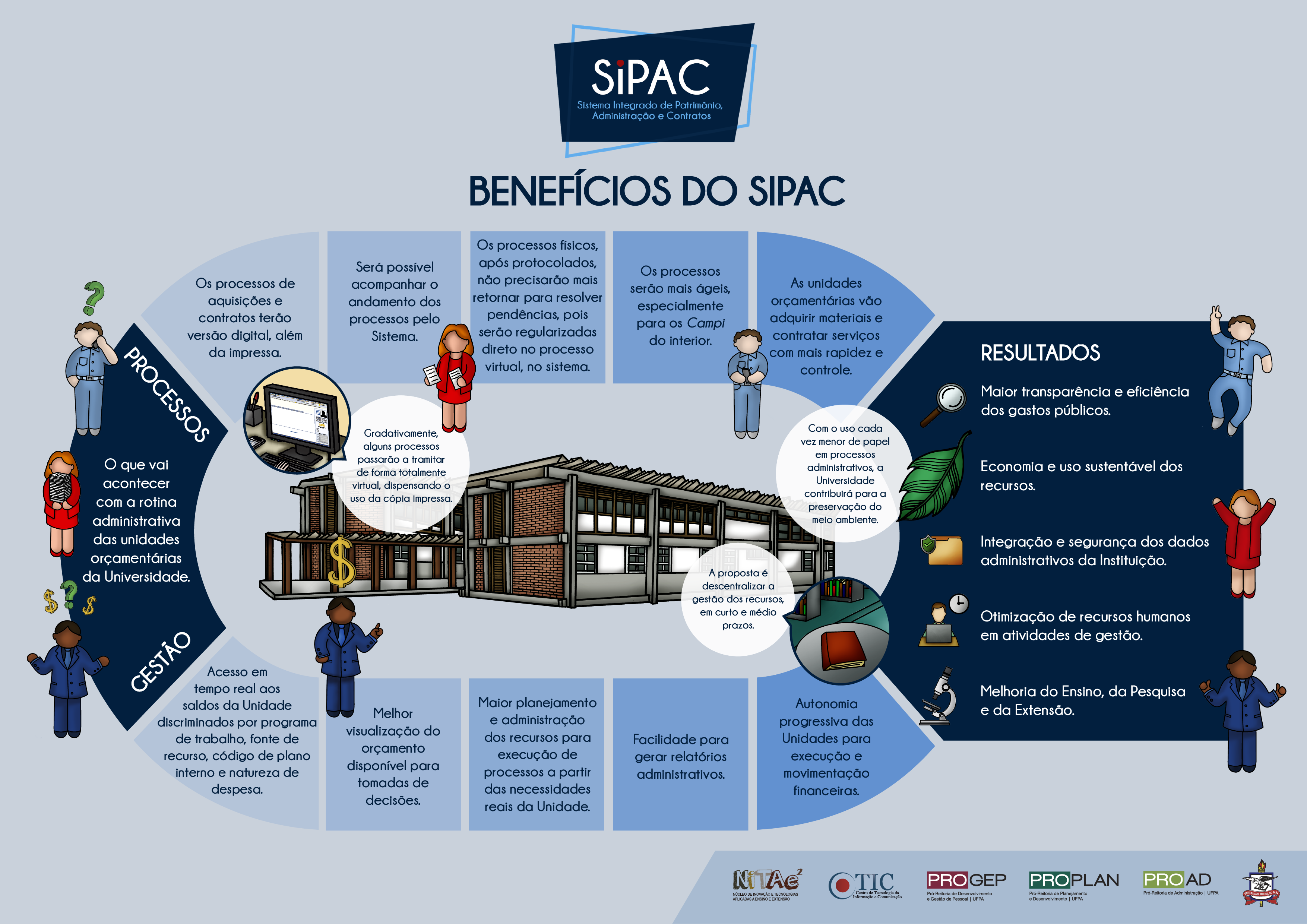 Agilidade, integração e transparência são componentes fundamentais na rotina administrativa de uma instituição pública. Com o objetivo de descentralizar sua gestão orçamentária e financeira, a Universidade Federal do Pará (UFPA) implantará novos módulos do Sistema Integrado de Patrimônio, Administração e Contratos (SIPAC). A proposta é que as Unidades orçamentárias (Campi, Núcleos, Institutos e Órgãos Suplementares) tenham maior autonomia no controle e na execução de seus recursos.