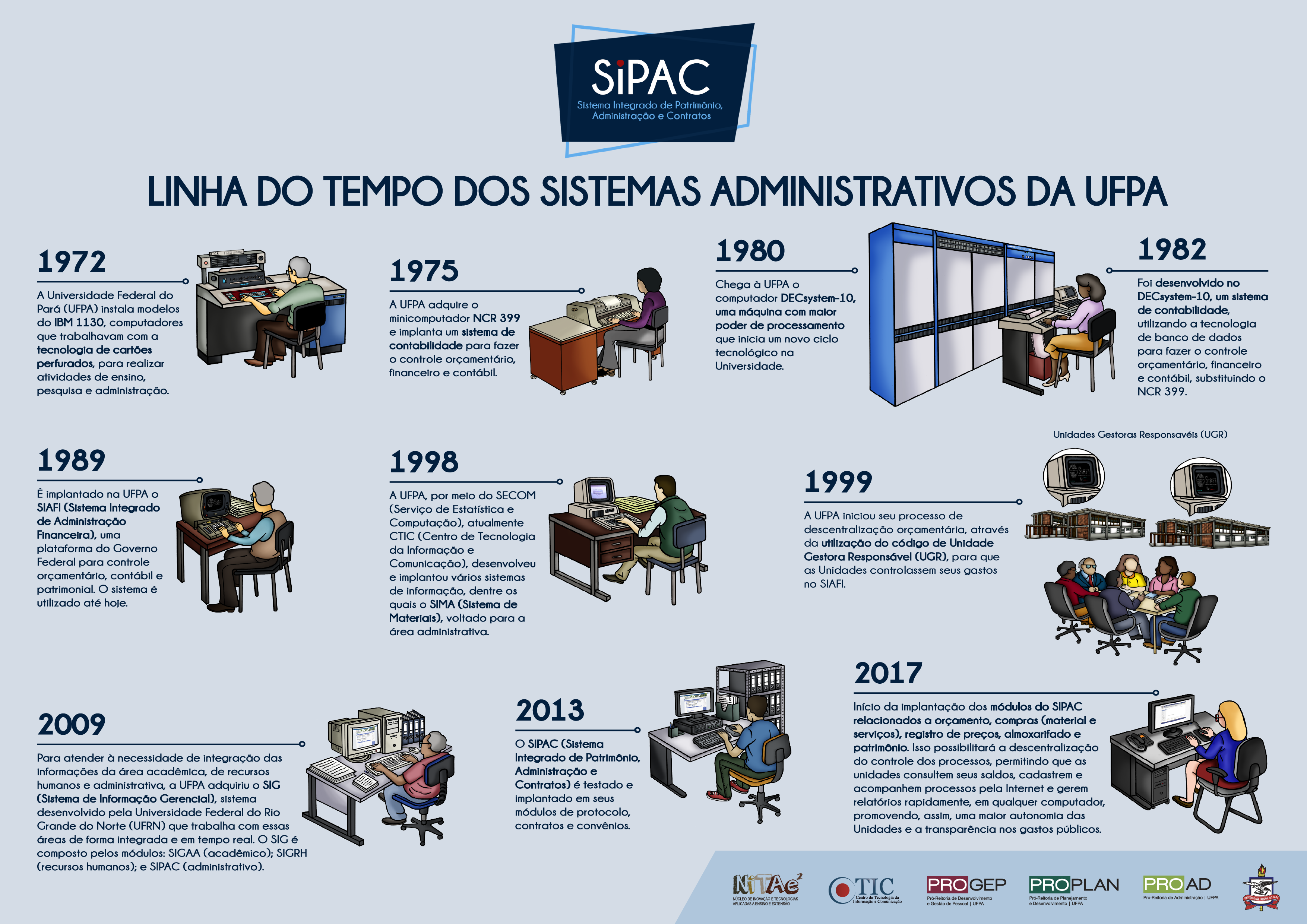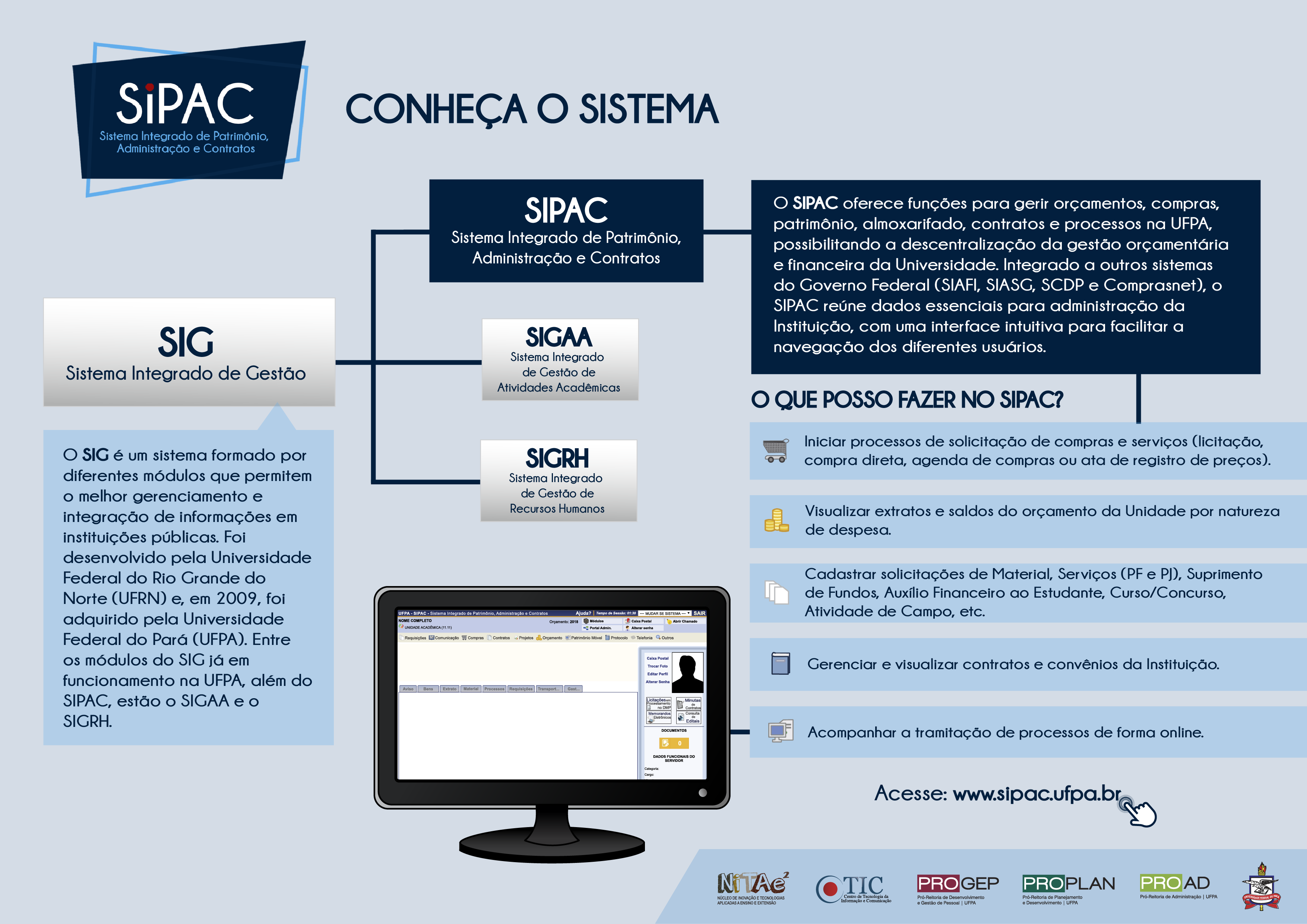 Sobre o Sistema - O SIPAC é um componente do Sistema Integrado de Gestão (SIG), desenvolvido pela Universidade Federal do Rio Grande do Norte (UFRN) e adquirido pela UFPA em 2009. Também compõem o SIG alguns sistemas já em funcionamento na Universidade, como o Sistema Integrado de Gestão de Atividades Acadêmicas (SIGAA) e o Sistema Integrado de Gestão de Recursos Humanos (SIGRH), além dos módulos de protocolo, contratos e convênios do SIPAC.