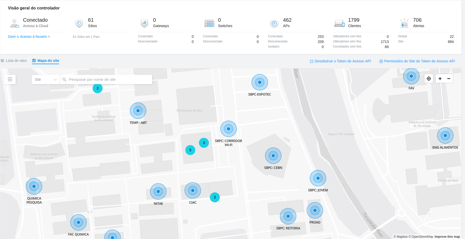 Monitoramento da rede: Durante o evento, a central de monitoramento da rede de internet recebeu todos os alertas de falhas em equipamentos, qualidade do sinal de rede sem fio, tráfego de dados, quantidade de usuários conectados e status do link de Internet da UFPA.
